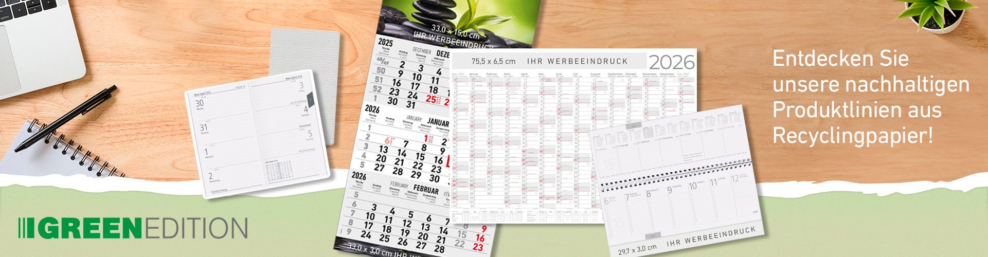 Mit dem Kauf Ihres Kalenders erwerben Sie einen voll recycelbaren Werbeartikel und sichern mit unseren zertifizierten Produkten die Wälder unserer Erde.